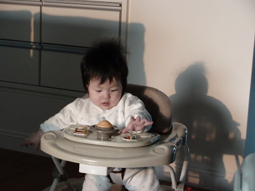 Mami loves the baby walker. It gives her free hands to get things done and not worrying about his potential falls. When he is in a good mood, in his walker, he loves running around and bang on the wall or anything that blocks his way. But when he isn't, he would cry and keep kicking his legs to avoid being placed in the walker. But mami manages to place him in anyway!!